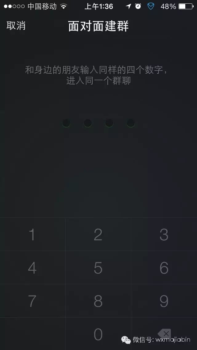 可能这些都不是大家所关注的重点,面对面建群相对来说更有用些。只要跟朋友几个人同时点击“通讯录”,再点击右上角的“添加朋友”,进入面对面建群功能之后,输入同一个暗号,也就是进群密码,四个数字匹配了便可以快速建群,几个人也能同时进入一个微信群。如图所示: