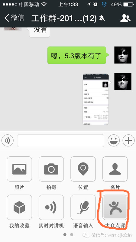 另外,在聊天窗口中,老马发现点击加号之后,拓展的窗口中出现了大众点评的入口。大众点评不仅在朋友圈发布中占据了位置上的特权,在聊天窗口再次出现,证明了腾讯收购大众点评绝对不是一件简单的事情。点击该按钮直接打开手机上已经安装好的大众点评APP,导流量以及方便用户的日常生活两全其美啊。如图所示: