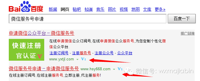 但是,今天老马要曝光的是最近百度上很火的一种代理注册公众帐号的骗术,我们首先打开百度,输入关键词“微信服务号申请”进行搜索,或搜索诸如公众帐号注册类的关键词都是可以的。从百度的搜索结果中,我们可以发现排名前两位的是投放了百度竞价广告的网站,如图所示:
