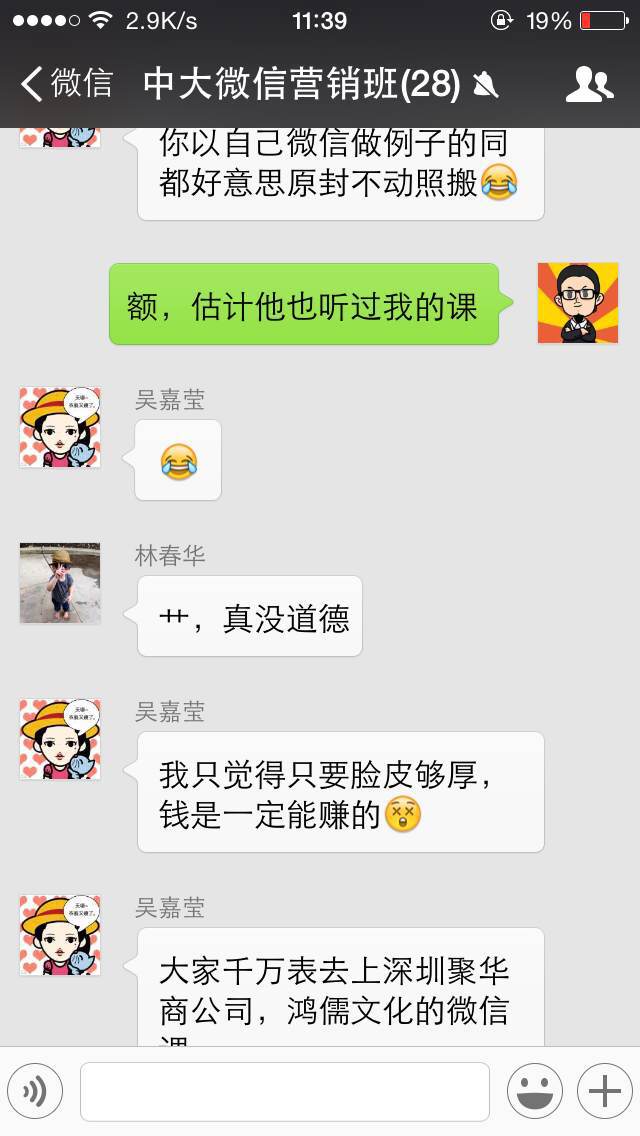这位叫胡涂的大师,注册了一家叫深圳市聚华商科技的公司,接着把老马2013年版的线下微信课程课件一字不漏地抄过去,搞了个两天收费2800的课程。当被老马以前的学员质问课程是否抄袭时,该大师很坦然淡定地回答:“是”。如此坦诚又心不跳面不改色地承认抄袭,直让老马感动地想哭。兄弟,看你忽悠人也不容易,别再讲那套老课件了,老马已经改版了好多次了,要不要新课件,可以找老马拿。不过,记得下次抄袭时打声招呼吧!胡涂大师的糊涂行径如图所示: