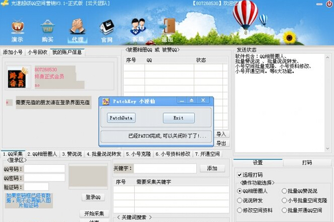软件现在集成了 QQ相册圈人,说说批量刷赞,批量修改小号空间资料,批量开通空间,空间QQ采集、批量克隆空间等七大功能!软件能够日圈10WQQ照片,无需换ip,自动打码登录,自动识别不能登录的QQ,自动识别没有相册,需要密码的空间,全自动24小时挂机操作。软件的截图如下: