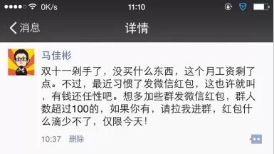 老马一直在强调,微信是强关系的,必须得想办法把陌生人变成最起码的网友关系,先沟通再卖货,走心,才能持久。凡是以量去推广,以广告去扫荡的,都是在瞎猫碰死耗子撞成交概率罢了。下面老马简单地写了一段文案,发到朋友圈,引导朋友们来发力,将老马拉进微信群。文案如下“双十一剁手了,没买什么东西,这个月工资剩了点。向来都是每个月月光,现在工资有剩花不完心里不舒服。不过,最近习惯了发微信红包了,钱有地方花了,这也许就叫有钱还任性吧。想多加些微信群发微信红包,群人数要超过100的,如果你有,请拉我进群,红包什么滴少不了,仅限今天!”好了,文案大概就是这样,你也可以自己原创一段,大致意思都差不多。发到朋友圈的效果如图所示: