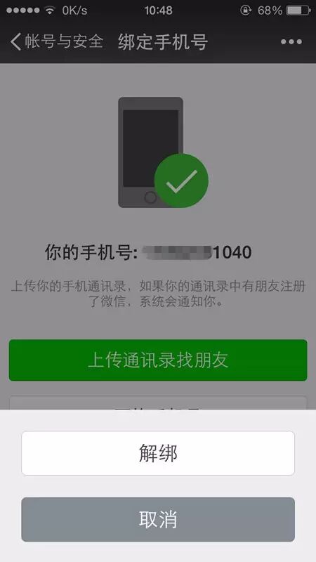 点击一下绑定的手机号码之后,进入了就是解绑的页面了。我们点击微信的右上角“…”三个点的按钮,选择解绑。这里主要就是为了把手机号码从你现在的个人微信号A中解绑出来,以便于接下来用该手机号码注册新的个人微信号。如下图所示: