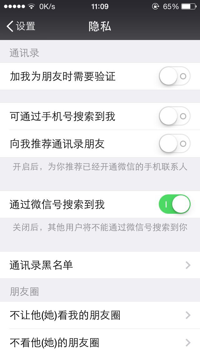 第一,你每注册完一个个人微信号,一定要把微信号给设置好,把微信昵称设置好,把头像设置好,把地区签名之类的通通设置好。其次,在微信的“设置”里面有“隐私”的设置,你应该把“可通过手机号搜索到我”以及“向我推荐通讯录好友”两个选项关闭掉。因为我们每注册一个新的个人微信号,为了方便注册下一个个人微信号,我们都会把绑定手机号解绑掉。所以,通过手机号搜索到你和向你推荐通讯录好友就没有任何意义了。如下图所示: