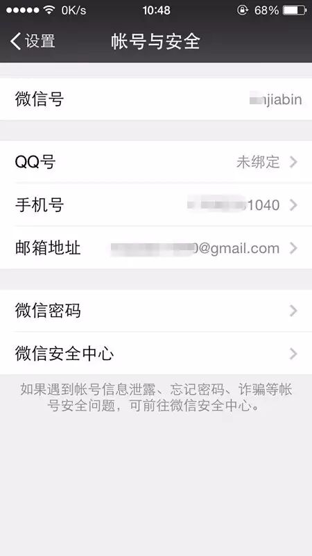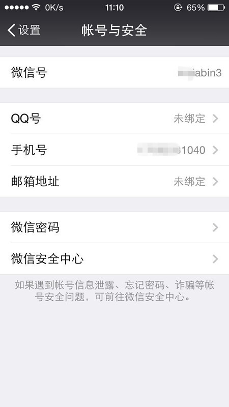 第一步,我们打开自己手机里面已经正在使用的个人微信号,比如你手机里面早就注册了一个个人微信号,假设叫A。打开了A个人微信号之后,我们点击“我”,在“我”里面有个“设置”,“设置”里面有个“帐号与安全”,你会看到自己的个人微信号的微信号,还有绑定的QQ、手机号码、邮箱、微信密码、微信安全中心。这时,我们只需要点击一下绑定的手机号码。如下图所示: