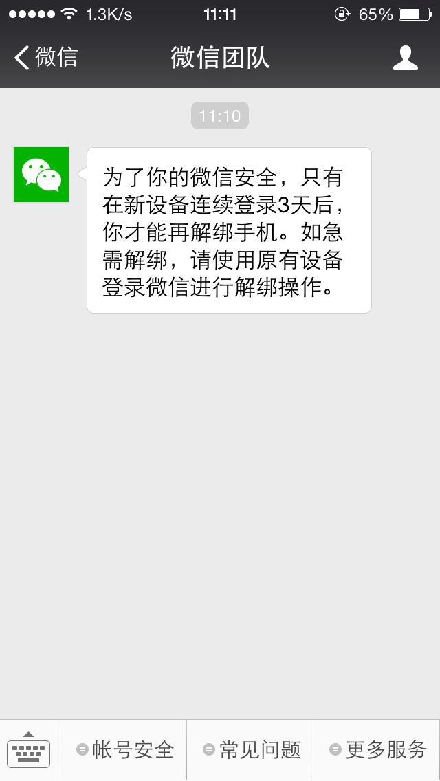 解绑成功后,我们就可以利用该手机号码来注册新的个人微信号了。当然,也会出现解绑失败的情况。造成解绑失败的情况是因为你的手机号码绑定A个人微信号的时间还不够三天,或者你这个手机号码原来是绑定另外一个个人微信号B的,而个人微信号B是在另外一部手机上登录的。这里就是老马前面提到的,不要老是更换手机来操作的原因了。微信是会识别你的手机设备的,你的个人微信号本来是在苹果手机上使用的,结果换了个安卓手机去登录,你看看微信是不是会要求你做个安全验证,才允许你正常登录使用呢?如下图所示: