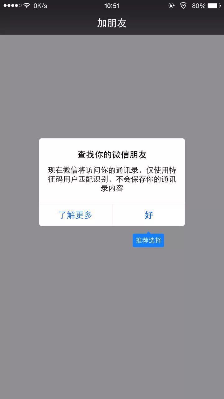 如上图所示,我们直接点“了解更多”,不要点击“好”。点击完“了解更多”之后,再点击下弹出页面中最底部的一段小文字,意思就是不需要微信来读取我们的手机通讯录,类似于取消的意思。我们之所以在这里不希望微信读取手机通讯录,这是因为新的个人微信号没必要把以前手机通讯录里面的微信好友再加一遍吧,你原来的老个人微信号A不就已经加过手机通讯录里面的微信好友了么,所以这里就不需要再重复添加了。