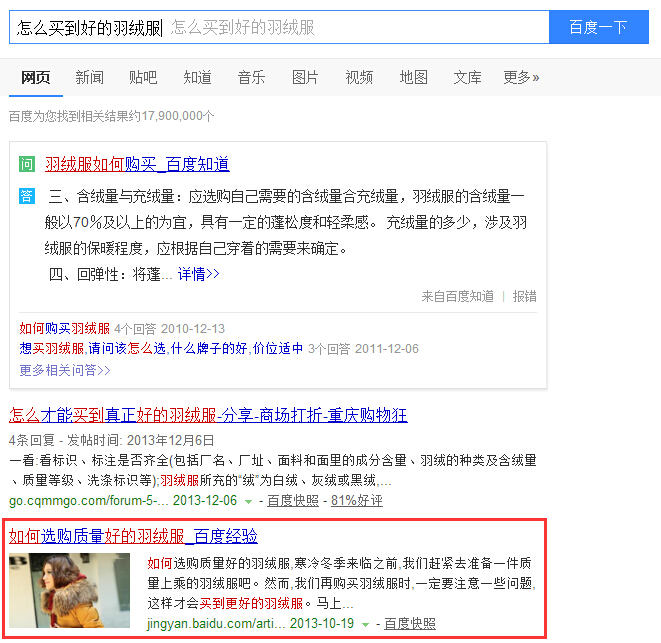 有没有发现,老马只是把关键词进行了一下重复,或者替换掉了同义的关键词。但是,这对于中文搜索引擎老大百度来讲,都不是问题,百度都会将其作为关键词。假设其它网民搜索的不是“如何买到一件好的羽绒服”,而是搜索“怎么买到羽绒服”,咱们写的这篇软文经验也会在搜索结果中展示,而且排名还较为靠前。