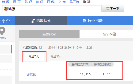 如上图老马想买一件羽绒服,但不知道怎么挑选。百度一下之后,发现“怎么,如何、好的羽绒服”这些关键词结果都出来了,而且百度经验的排名在第三位,这就说明选择关键词很重要了。在选择关键词方面,我们可以利用百度指数来进行筛选。打开百度指数网站:http://index.baidu.com ,然后输入“羽绒服”,查询后的指数如下图所示: