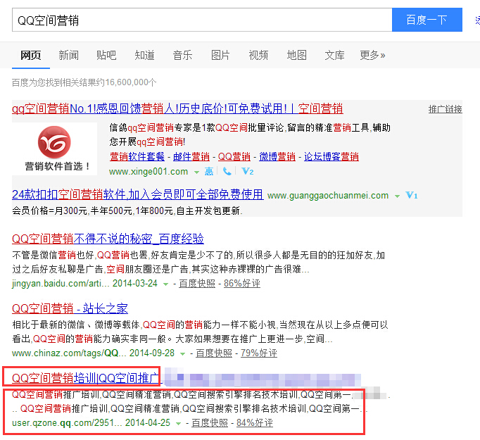 咱们前面的文章中已经提到了百度指数,你确定做某个关键词的时候,就去查一下百度指数(没有指数的关键词做了没有多大意义)。只要是指数不是很高的,做起来的难度都不大。我们来看下挂黑链的这个人,他是做“QQ空间营销”这个关键词的,在百度搜索结果中排名很不错。如下图所示: