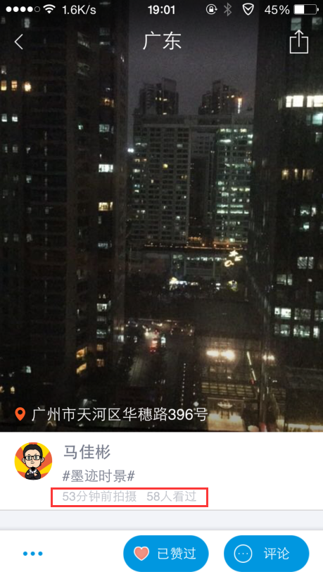 那么,假设你分享了一张了时景照片,到底有没有用户去看呢?答案是有的,虽然每张普通的照片看的人并不多,但发得多了,加起来浏览量也是不错的。如果你拍的照片有幸成为热图,那么浏览量会更加地多。所以,拍时景发照片这个事情需要坚持不懈地操作。与此同时,你拍的照片有多少人阅读都会有统计,甚至别人还可以给你点赞,评论。如下图所示: