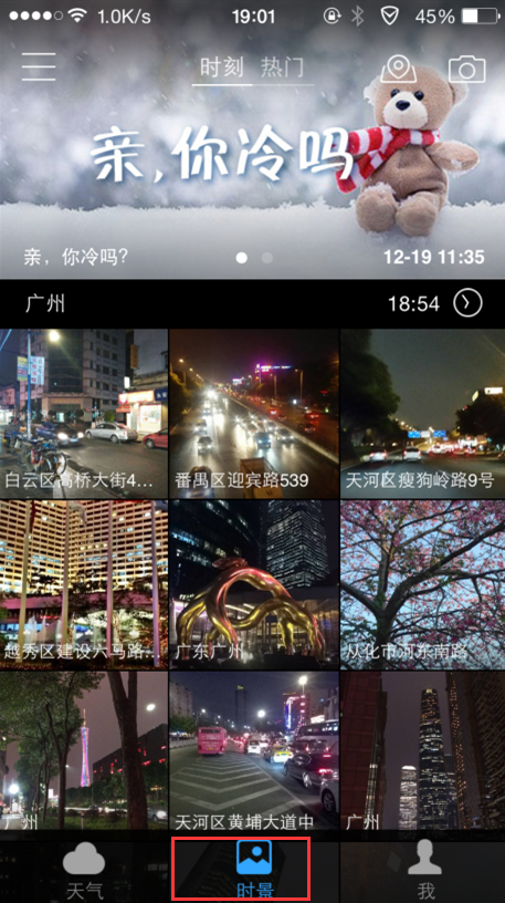 这时,老马相信你应该发现了墨迹天气里面有个功能叫“时景”,点进去后,发现有好多网友用户都在分享自己所在地区,即时的城市风景照片,或是现场风景照片。时景的意思其实就是某一个具体时间,在某个地方,拍下来的景物照片。凡是用墨迹天气这款APP的用户,他们都可以自己拍摄时景照片,分享出来。如下图所示: