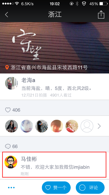 另外,除了照片上下功夫之外,地理位置也是可以下功夫的。你如果只在广州地区分享时景照片,墨迹天气在你每次分享照片的时候,都会调用你手机的定位,对于针对本地人群的推广引流,那是没有问题的。如果你想做全国推广引流,那是不是说修改下手机的地理位置,从广州改到北京,分享的时景图片就到北京地区展示了么。所以啊,思路是很多的,如果你是安卓手机,下载个手机定位伪装修改的APP就搞定了。除此之外,评论功能也是可以充分利用的哦,如下图所示: