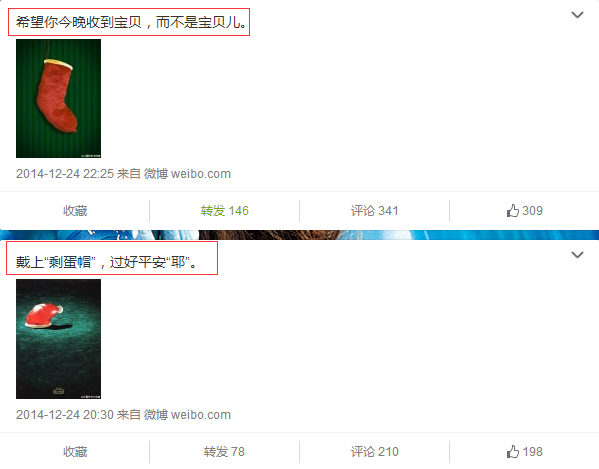 在微博这样碎片化的强媒体平台上,段子是流传最快最广的,吸引受众传播的动力也比较强。网民上网终究较多的是娱乐,凡是能引起共鸣或者博人一笑的内容,大多文案不会差到哪里去。我们一起来看看杜蕾斯的几则微博文案,基本就能判断出其中的规律。这点与藏头诗或者换词造句有点类似,但不同的是杜蕾斯很会抓热门事件借力。如下图所示,杜蕾斯借助圣诞节,换词造句,硬是把自己的品牌或产品融入进去,甚至多了一层隐晦的意思,而这层隐晦的意思就是网络上所说的内涵。什么内涵冷笑话、90后非主流文化大多是如此。