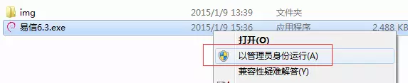 下载好软件之后解压,你会看到一个易信6.3 的exe 文件,如果你是xp系统的话就直接双击打开运行。如果是win7和win8双击打开不能运行的,请右键点击选择以管理员身份运行。如下图所示: