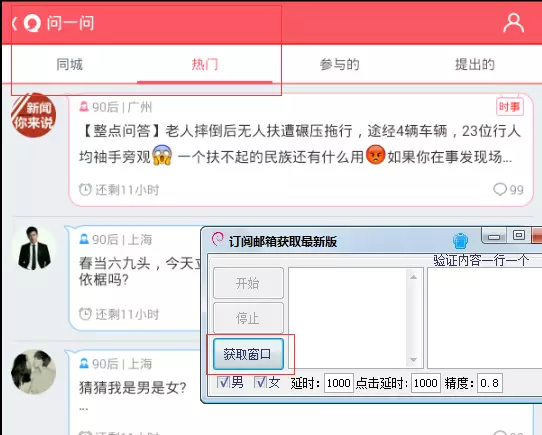 辅助软件运行了之后,你需要拖到刚刚我们已经在运行着易信的安卓模拟器旁边。然后点击辅助软件的“获取窗口”按钮,接着把鼠标移动到易信的“问一问”页面窗口两秒钟,辅助软件就能成功获取到窗口了。获取窗口成功之后,你可以在右边输入一些添加好友时的验证信息,比如“你好,请加我”,或者“你好,加个好友吧”等等。这个跟微信打招呼是类型的,当然你也可以不输入。最后,点击开始,辅助软件就会帮你批量添加易信好友了,你只需挂着电脑就行。如下图所示:
