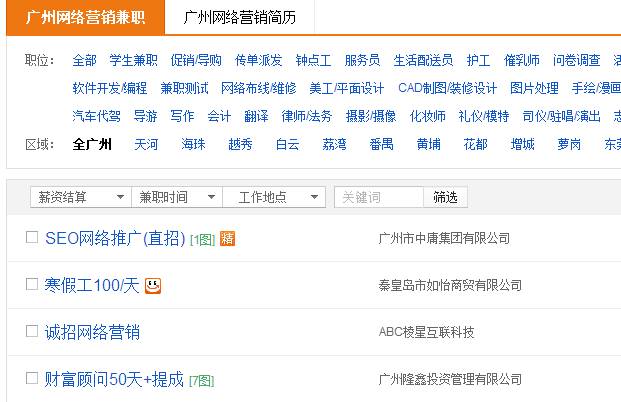 58同城、百姓网、赶集网这些分类信息平台都可以在招聘模块发布信息,只需要注册个帐号即可。当然,有公司的人拿相关执照来注册,发布信息的可信度以及转化率就更好了。而且,招聘板块中的兼职板块,不像分类信息平台上其它的模版,有收费的广告形式,相对应地竞争就少一些。如下图所示: