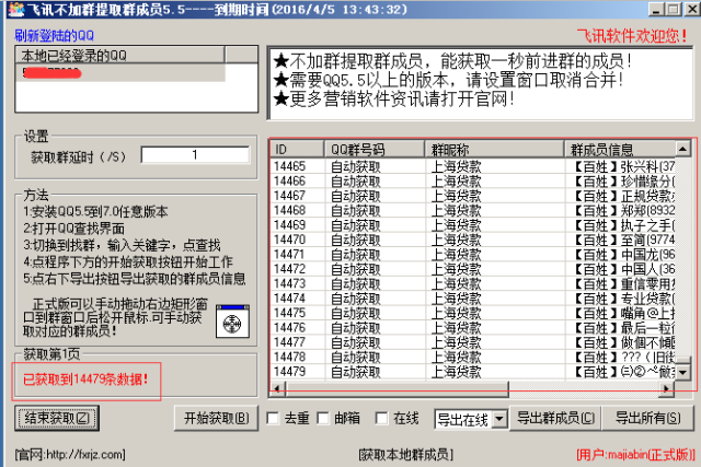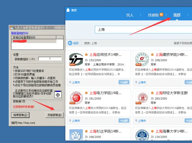 注册完帐号之后,我们登录一下软件,如果这时你的电脑已经登录了QQ的话,软件会自动识别你已经登录的QQ号。当然,老马建议你安装新版本的QQ了,QQ5.5到7.0的版本都是OK的。那么接下来就是打开你电脑已经登录了QQ,点击查找按钮,选择找群,然后输入关键词来找群。找完群之后,点击开始获取按钮即可,这时你只需要等待,软件就会自动去操作了。如图所示: