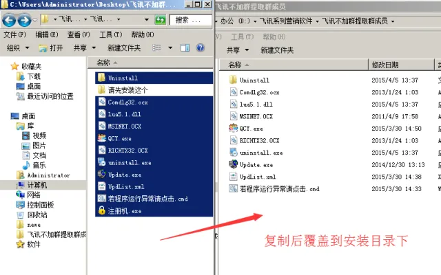接着就是打开了软件安装所在的文件夹了,我们现在需要做的是把文件覆盖一下,还是回到老马给你的软件压缩包看看,你会发现刚刚那个“请先安装这个”的文件夹,还有其它的一些文件和文件夹什么的,这些就是我们要复制了,然后覆盖到软件安装所在的文件夹的(这一点如果不理解,请多看几次老马给你们打包的安装视频教程)。如图所示: