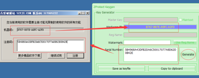 成功打开运行了软件之后,接下来就是要对软件进行注册破解了。这个注册破解的过程,老马在上一篇文章中也讲过了。这里还是继续说明一下,免得有些小白粉丝不会操作。首先,我们刚打开运行软件时,它会弹出一个注册窗口,我们只需复制注册窗口中的机器码,然后再打开老马给你的软件压缩包,里面有个注册机对吧。打开运行下注册机,然后在注册机窗口中粘帖刚刚复制的机器码,再点击下“Generate”按钮生成注册码。然后复制注册码,把复制了的注册码粘帖到注册窗口,最后点击注册就大功告成了。如图所示: