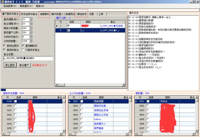 好了,今天还是跟大家介绍一种可以用于微信推广引流的软件,其实这款软件的功能不仅仅是用于推广引流,还可以用来查询目前自己个人微信号的好友情况。相信大家以前都知道有一款软件叫微信猎手,可以查出你的微信好友中有谁删除了你。因为微信本身是不会告诉你,你的好友有谁把你给删除了,所以很多人现在的微信好友超过了5000个人,而超出那部分人其实已经删除你了。但是,微信猎手这款软件早前时间失效了,不好用了。而且,微信猎手也不能查出谁拉黑了你。那么,今天老马要给大家介绍的这款软件就具备查找微信好友谁删除了,谁拉黑了你,并进行备注的功能。当然,这只是基础功能之一了。