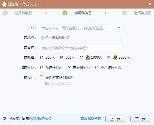 创建QQ群的时候需要选择好你的类别,比如我们在这里选择行业交流类别。然后进入下一步的群信息设置,这里还需要你选择更为具体的行业。群地点的话也要设置,可以把群定位到具体的地点。这点是比较好的,为什么呢?比如你是小商品的生产厂家,你创建了一个“义乌小商品批发群”,把群地点定位到了浙江义乌的小商品批发市场,那么市场上那些批发档口的商家就可以优先找到你的群,加入后找你批发货源了。QQ群默认的群搜索结果排名中,群地点是第一个要素,比如同样的10个群,群地点离你最近的,会出现在第一位。所以,大家要注意群地点一定要设置,甚至设置精确到某条道路,这是有帮助的。