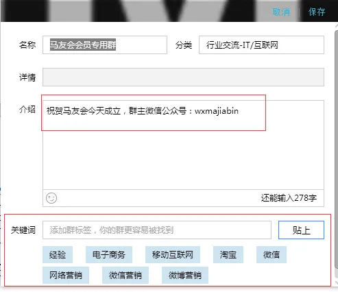群介绍老马建议你一定也要加上关键词,还是那句话,我们前面举例自己已经创建了一个“工业机械客户交流群”了,那么在群介绍这里,你就可以更为详细地设置为“鼓风机交流、注塑机交流等等等”,这样子设置也是为了方便我们的客户找到群。同样的,群关键词标签你也贴上几个,最后点击保存。这个群就算搞定了,不过还有些细节会决定QQ群在群搜索结果中的排名。