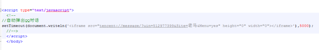 首先,我们以你的网站首页为例,打开你网站首页的源文件,一般都是以index.htm或index.html或index.php等等为命名的文件。打开了之后,我们在源文件的代码里面添加入一段代码,这段代码就是QQ自动弹出会话的代码了。加这段代码之前,你先把老马给你的代码中的QQ号码修改成你自己的,把里面的中文名称“老马”修改成你公司的名称或者网站的名称,最后把该段代码插入到源文件的<body></body>的标签范围内,保存一下源文件,你的网站首页就大功告成了。可能对于不懂html的人来讲,以上做法根本看不懂,那老马只能建议你找个懂的朋友教你怎么弄了。如下图所示:
