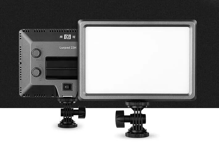 还有一种便携式的小型补光灯,适合户外或者小空间范围的补光,这种平板型补光灯使用可充电锂电池供电,支持色温亮度调节,配有热靴接口,搭配安装在手机支架,或者单反相机等设备上使用,如图: