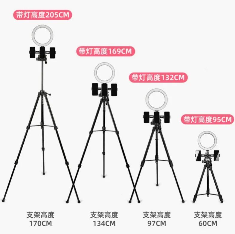 首先是最受主播欢迎,也是最常用的环形灯,看起来就像是一个圆圈的灯,有桌面款和落地款,配有支持多机位的手机支架,可以调节光线的色温和亮度,优势是性价比高,可以作为主光对主播进行美颜,也能让主播的眼睛看起来像戴了美瞳一样有神,如图: