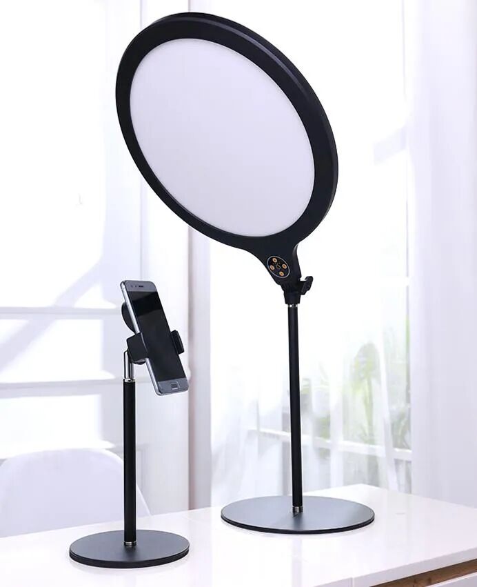 不同尺寸的环形灯补光的范围也不一样,小尺寸的自然补光范围小,大尺寸的同理,所以后面又出来环形灯的升级版,也就是圆形平面补光灯,解决了环形灯光线不足的问题,而且也脱离了手机支架,可以单独使用,如图: