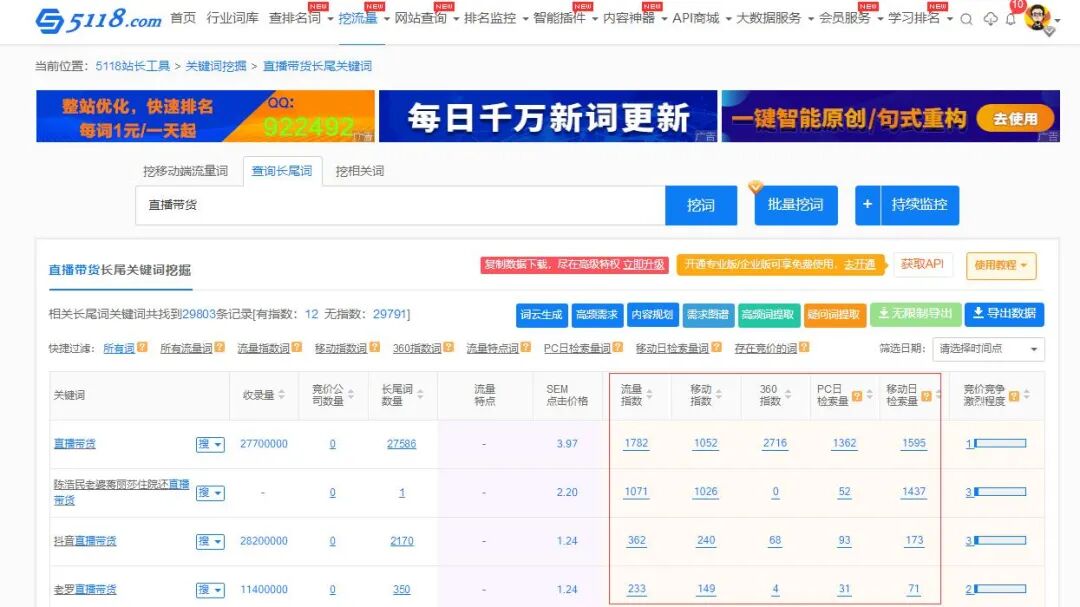 有了文案素材之后,下一步是准备一堆长尾关键词,是的,不是一两个,而是一堆跟你所做的产品、项目相关的长尾关键词,不要短尾关键词,竞争大难做排名,效果不好,长尾关键词我们可以使用5118去挖词,如图: