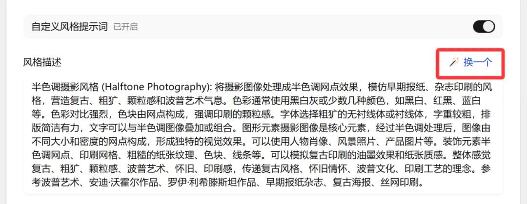 开启自定义风格提示词后,就等于不选择默认的那些模板了,你可以通过更改提示词,来创建自己喜欢的模板风格。