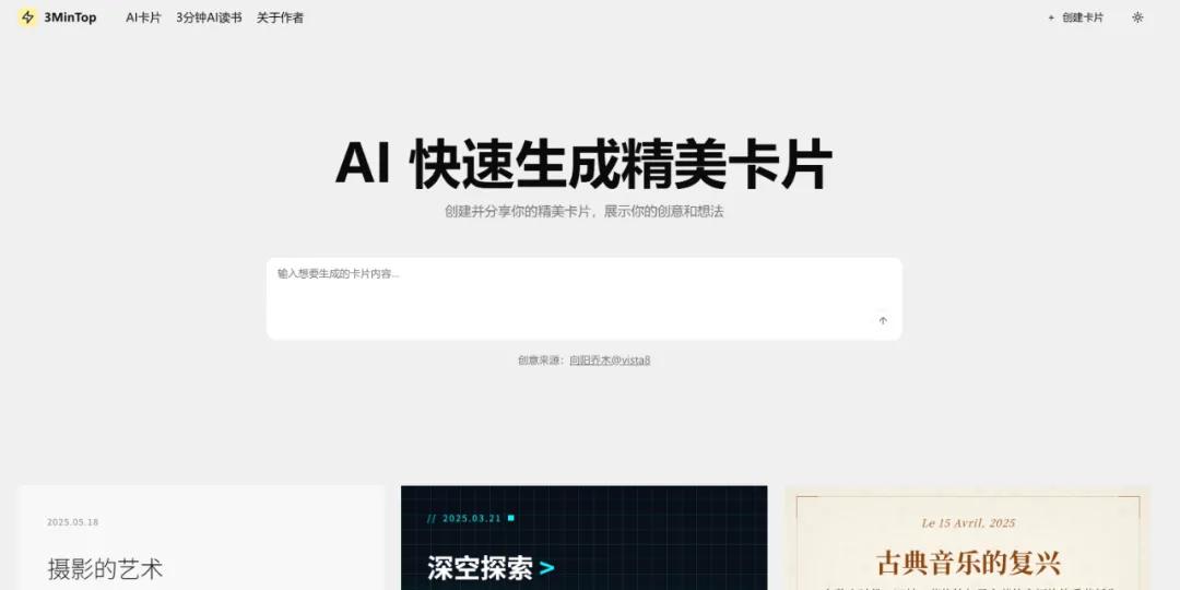 3mintop官网地址:https://card.3min.top,网站是不需要注册的,也没有积分机制,简单的说就是随便用,如图: