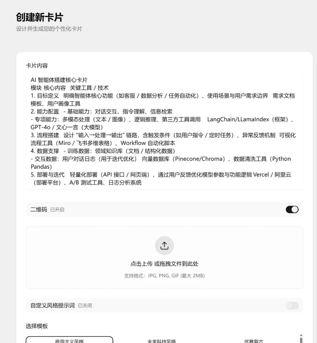 老马这里就准备了一份简洁的内容,主要是关于AI智能体搭建的,在对话框中输入,提交后即可进入卡片生成设置页面,如图: