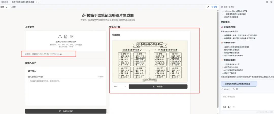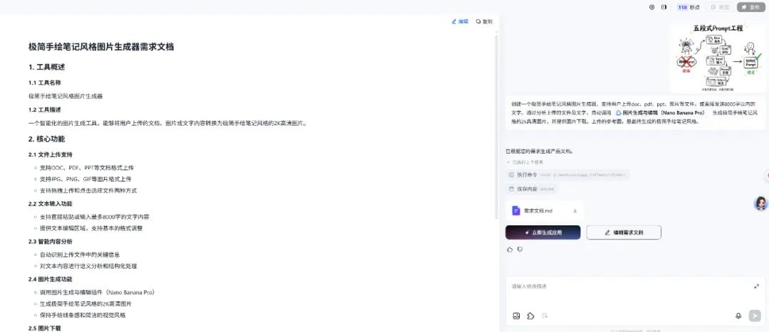 确认需求文档,立即生成应用,基本上秒哒都能一次过,生成的应用就能直接使用了,老马也上传了一张表格,成功生成了一张极简笔记图,如图: