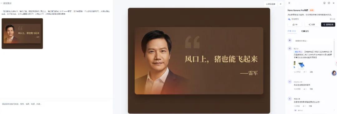 当然,你如果复制都懒得复制,那就直接在这里使用Nano Banana Pro,反正是免费无限制的,也能上传参考图,老马就随便生成了一张雷军的语录,如图: