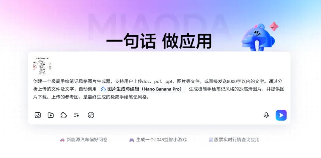 下面老马就来演示一下,利用秒哒上面的Nano Banana Pro插件,制作一个可以生成极简手绘笔记风格图片的应用。