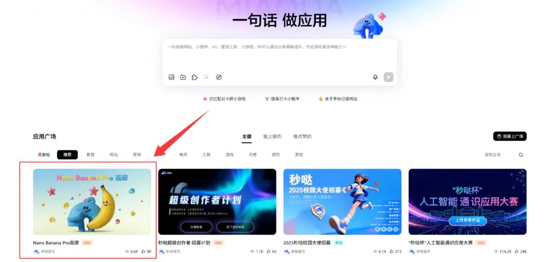 我们直接在秒哒官网首页的应用广场,找到这个Nano Banana Pro画廊